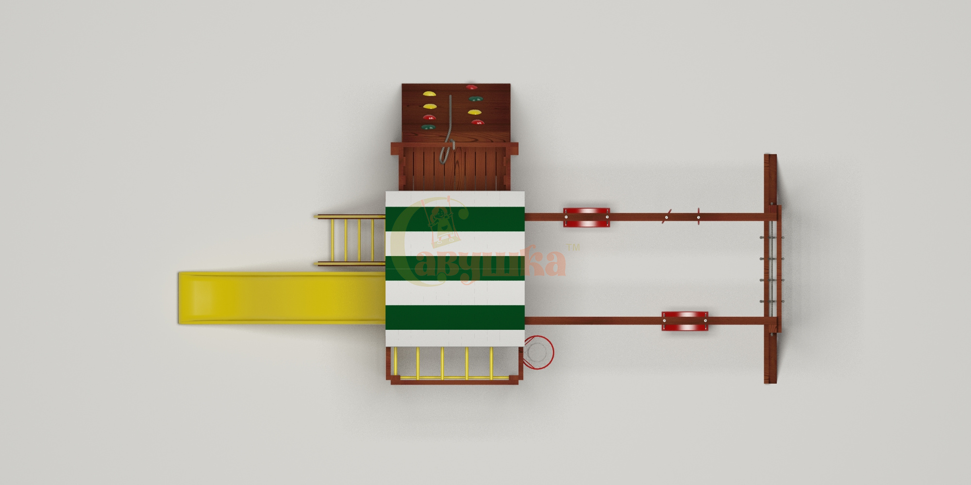 Детская площадка Савушка Хит 3 поможет обустроить во дворе зону для активных детских игр. Рама комплекса собирается из экологичного, прочного, долговечного материала – клееного бруса с квадратным сечением 75 х 75 мм, а затем покрывается лакокрасочным покрытием, которая подчеркивает натуральную фактуру древесины и защищает ее от осадков при любых погодных условиях. Все поверхности тщательно отшлифованы на специальных станках, а углы скруглены. -