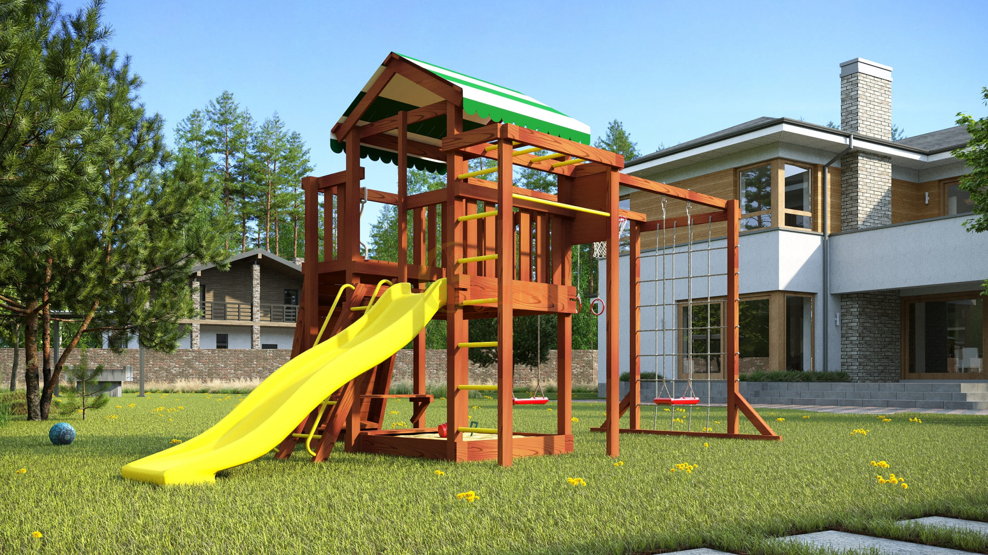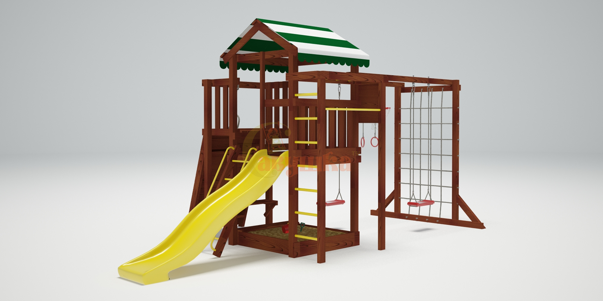 Комплектация: качели Лодочка 2 шт., кольца гимнастические, кольцо баскетбольное, лестница с металлическими ступенями и перилами, песочница, рукоход, сетка-лазалка, стенка альпинистская, столик, турник металлический, шведская стенка, лавочка на песочницу.