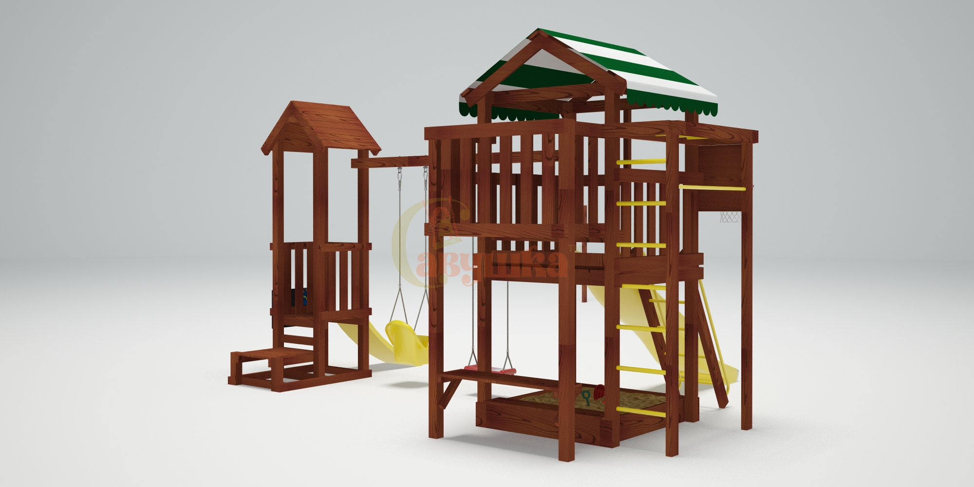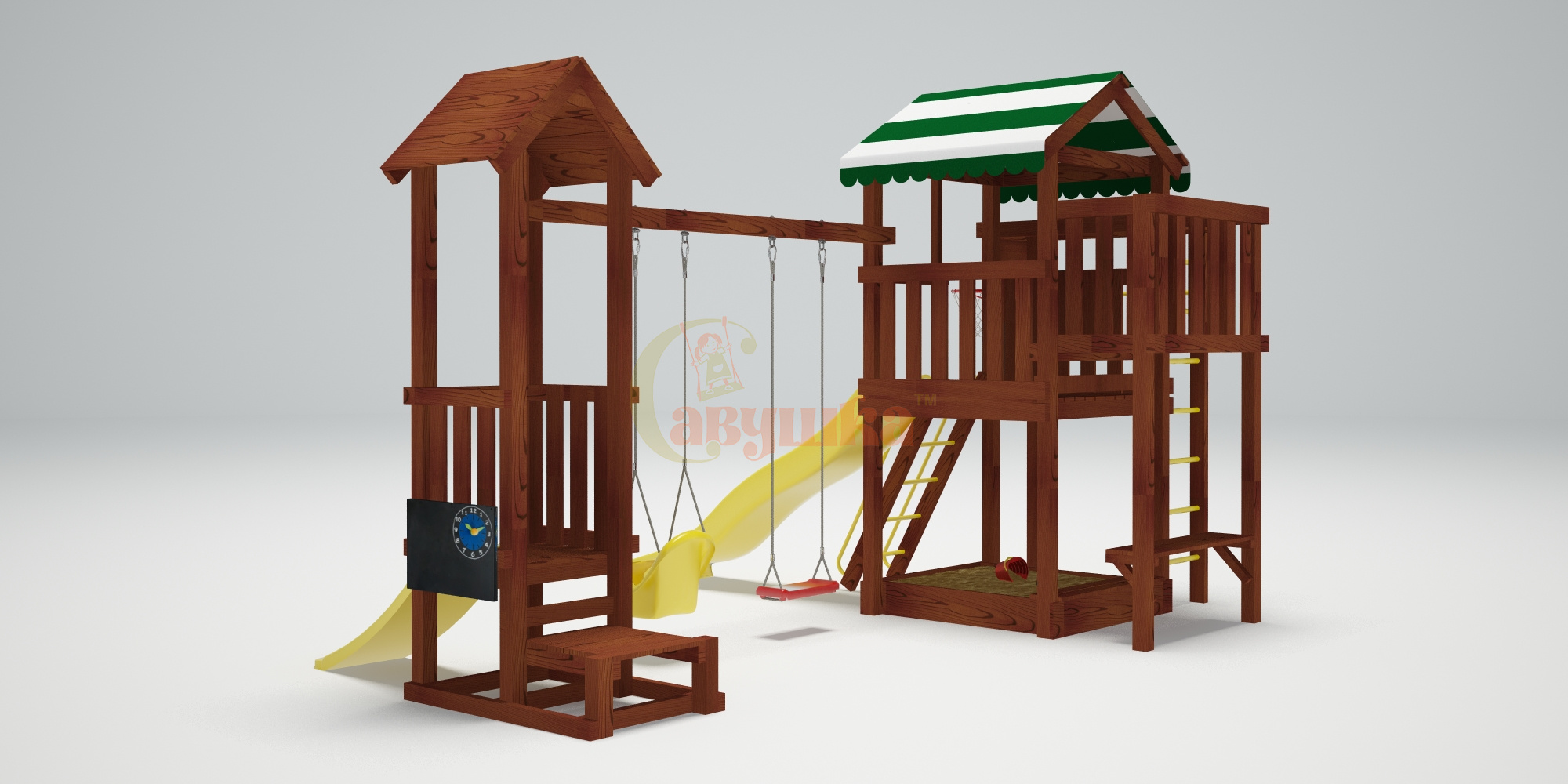 Комплектация: качели Лодочка, качели со спинкой Люкс (Бельгия), кольцо баскетбольное, лестница с металлическими ступенями и перилами, меловая доска, песочница, рукоход, столик, турник металлический, шведская стенка, лавочка на песочницу.