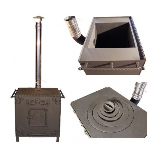 Название этой печи говорит само за себя. Она изготовлена из стали толщиной 3 мм и снабжена чугунной плитой со встраиваемыми кольцами разного диаметра. Благодаря этому печь можно использовать на протяжении многих лет и устанавливать на нее посуду любого размера. Сложная конструкция печи включает в себя два корпуса - внутренний и наружный. Наружная часть с чугунной дверкой (250 х 290 мм), боковыми ручками, зольником и декоративными элементами предназначена для лучшего удержания жара внутри печи. Во внутреннем корпусе осуществляется непосредственно горение, а благодаря серьезным усилениям (ребрам жесткости) он способен выдерживать огромные температуры. Нижняя часть внутреннего корпуса оснащена чугунным колосником, позволяющим своевременно избавляться от не дающей жара золы. Во время использования данной печи Вы можете контролировать интенсивность горения благодаря задвижки на дымоходе и готовить любимые блюда на высшем уровне! -
