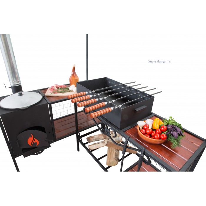 Конструкция разбирается на крышу, арки, стойки, основание, жаровню, печь под казан и дымоход.