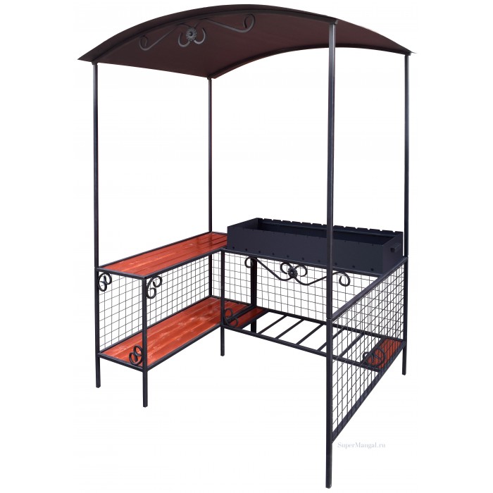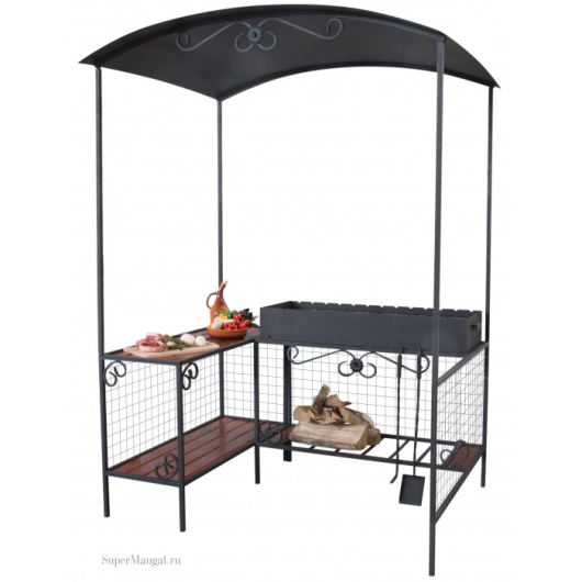 Мангал-беседка ММ26 - надежное и практичное изделие с крышей и метровой широкой жаровней. Крыша представляет собой лист стали, толщиной 1 мм, которая всегда укроет вас от холодного дождя и снега или палящего солнца. Мангал разборный и удобен при перевозке. Имеет съемную крышу, жаровню, квадратный профиль с сечением 20 мм и толщиной стали 2 мм, который удерживает крышу. Основание мангала делится на 2 секции, слева: столик с деревянными столешницами, а по центру и справа стойка под жаровню со стенкой-сеткой. Обе секции имеют в своей конструкции удобные, вместительные нижние полки и столик, справа от жаровни на которых можно разместить кухонную утварь, казаны, кастрюли или использовать их как дровницы. Жаровня мангала выполнена из высококачественной 3 мм стали, а швы изделия проварены полностью. Мангал-беседка СМ26 подойдет для размещения на Вашем дачном участке.