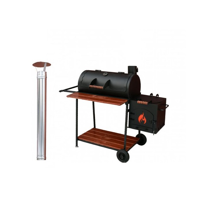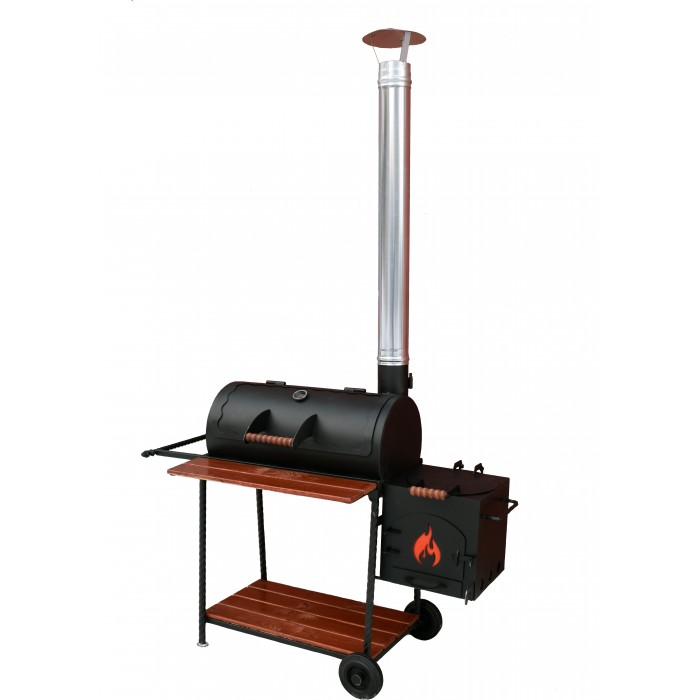 - большие прорезиненные колеса и кованая ручка делают этот смокер мобильным. Передвижение по участку не требует больших усилий.