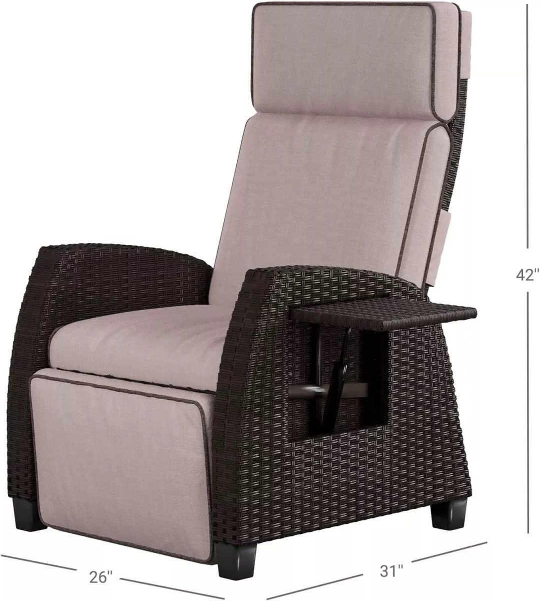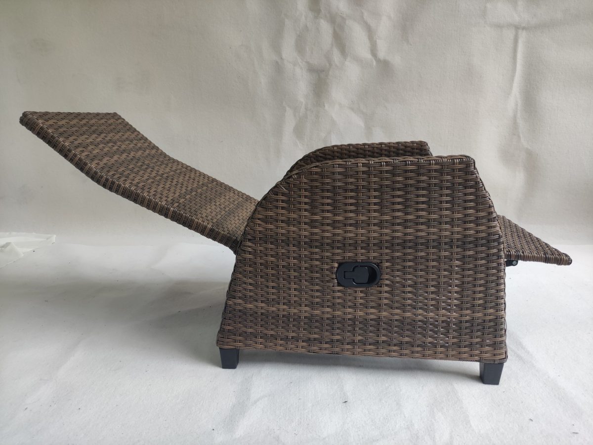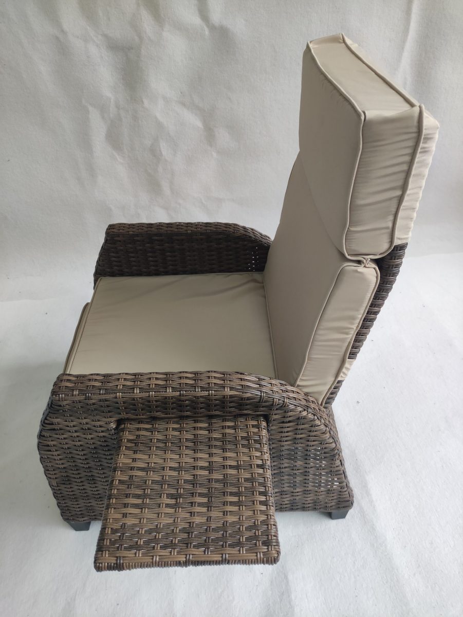 Кресло реклайнер из ротанга Гранд Патио "Grand Patio" brown имеет удобную высокую спинку, водо-грязестойкий матрас и откидной столик из подлокотника. Кресло может фиксироваться в трех положениях: исходное-сидя, откинувшись и полулежа. Кресло имеет стальной каркас и стальной механизм. -