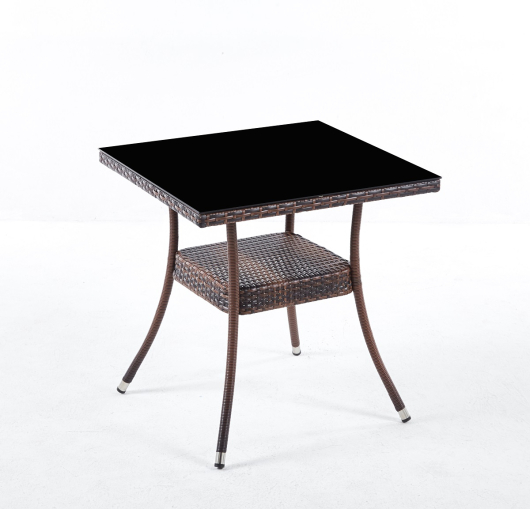 Каркас изготовлен из прочного металла, вручную оплетенного искусственным ротангом. В качестве столешницы использовано ударопрочное стекло, толщиной 5 мм. На стол можно ставить горячие тарелки и чашки, не опасаясь деформации покрытия.