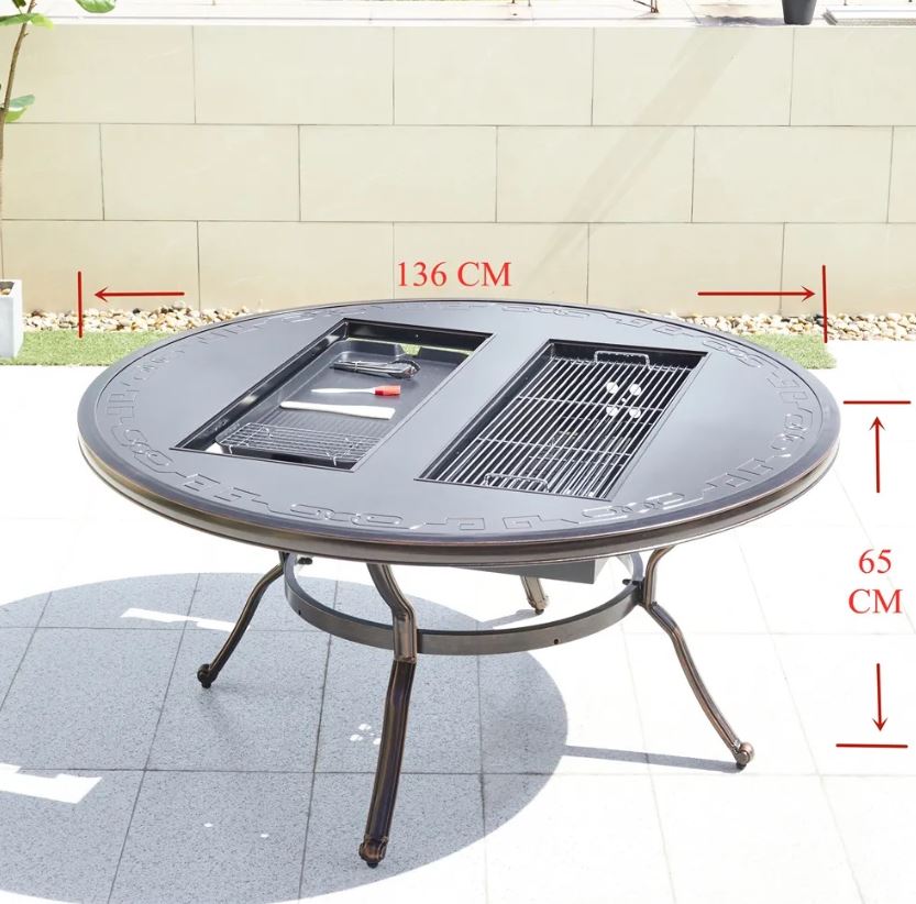 Металлический стол из литого алюминия с мангалом будет незаменим для тех, кто любит отдыхать на садовом участке в большой и дружной компании. Литые алюминиевые столы этого типа предназначены для приготовления различных продуктов не решетке, которая идет в комплекте. При необходимости его можно использовать по прямому назначению, закрыв мангал специальным диском. -