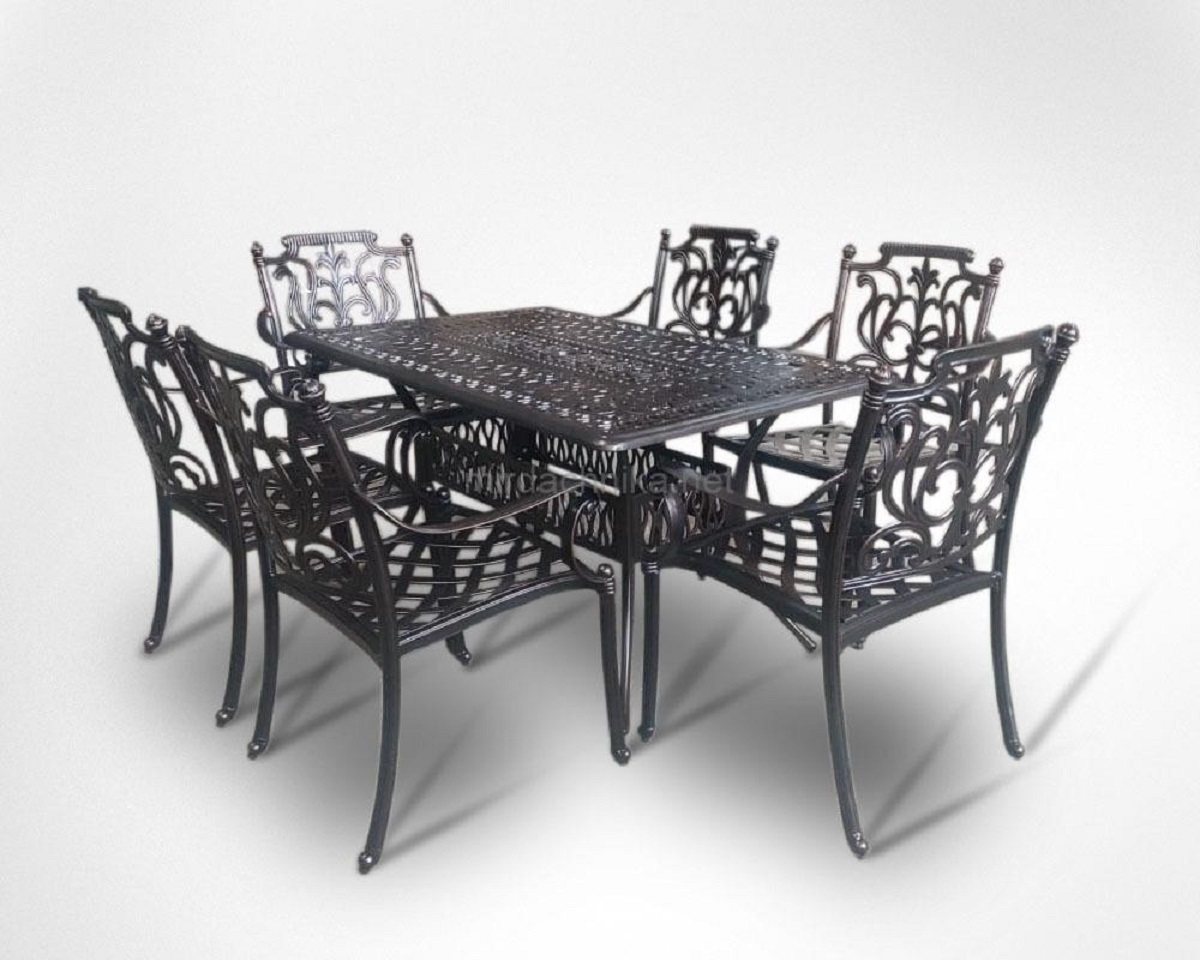 Обеденная группа из литого алюминия стол Феникс + 6 кресел Миранда не требует тщательного ухода, долговечна, устойчива к перепадам температур. Обеденная группа из литого алюминия смотрится стильно и богато, может быть использована в гостиницах, домах отдыха, кафе и ресторанах. Комплект мебели хорошо гармонирует с современными стилями от классики до современного дизайна. -