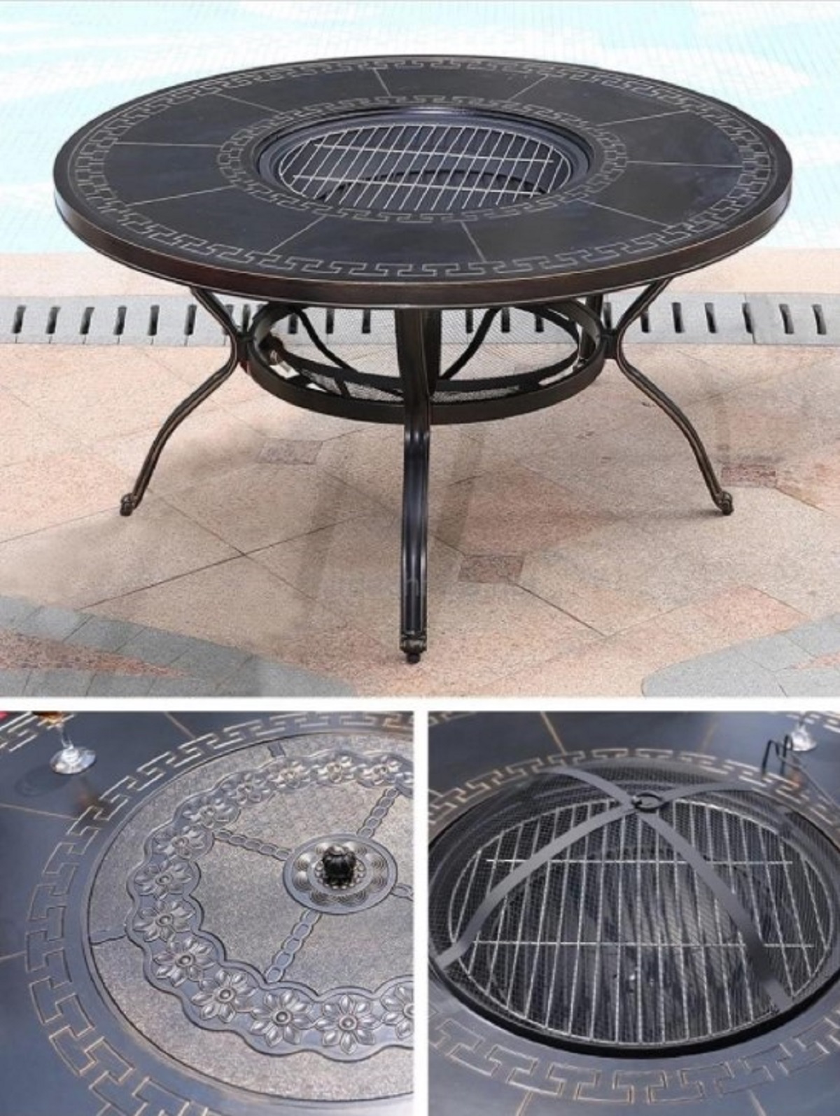 Комплект из литого алюминия с мангалом будет незаменим для тех, кто любит отдыхать на садовом участке в большой и дружной компании. Литые алюминиевые столы этого типа предназначены для приготовления различных продуктов не решетке, которая идет в комплекте. При необходимости его можно использовать по прямому назначению, закрыв мангал специальным диском.