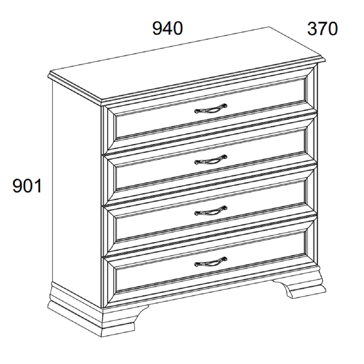 Комод 4S Тиффани станет отличным дополнением и настоящим украшением для уютной комнаты. Такое изделие приятно удивит удачным сочетанием компактности и необычайной вместительности. Комод имеет четыре широких выдвижных ящика, которые можно использовать для бережного хранения одежды, постельного и нижнего белья. Сверху Вы сможете разместить несколько семейных фотографий, вазу или вазон с красивыми цветами и другие оригинальные изделия. -