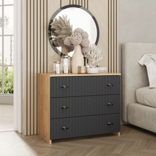 Комод 5 с изящным дизайном станет стильным украшением вашего дома. Необычный декор фасадов придаст изюминку интерьеру. Корпус в древесных тонах гармонично сочетается со стильным декором фасадов.
