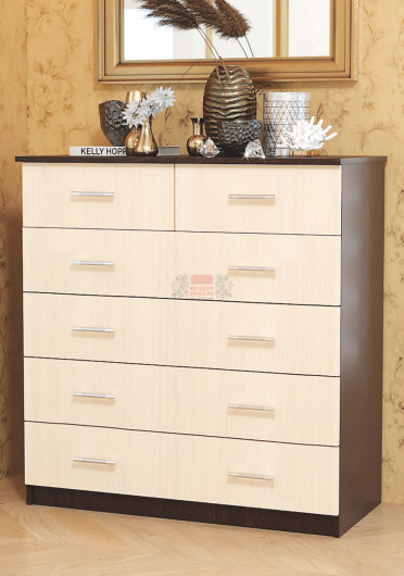 Комод 6 станет прекрасным дополнением уютной спальни, в которой вы сможете отдыхать не только телом, но и душой. Изделие предоставит дополнительное место для вашего гардероба. В выдвижных ящиках вы сможете хранить одежду, нижнее и постельное белья, косметику и разнообразных аксессуары. На комоде будут отлично смотреться несколько фотографий, ваза с цветами и оригинальные предметы декора.