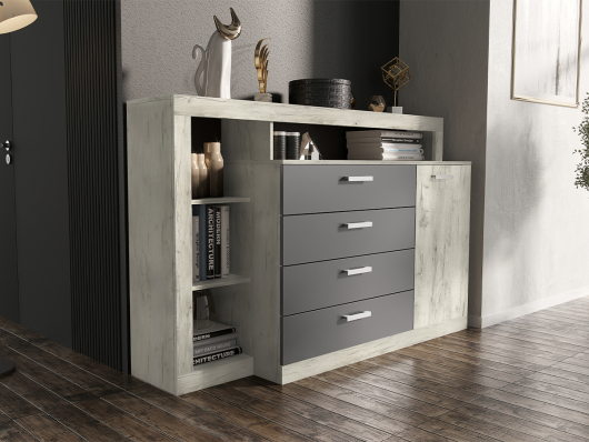 Комод Ангара функциональный и удобный предмет мебели, способный гармонично вписываться в любое помещение. Комод Ангара с комбинацией закрытых ящиков и открытых полок особенно популярен среди тех, кто ценит сочетание практичности и стиля. Закрытые ящики отлично подходят для хранения белья, одежды, постельных принадлежностей и прочих необходимых вещей, сохраняя их чистыми и защищенными от воздействия окружающей среды. Открытые полки предоставляют дополнительное пространство для демонстрации красивых аксессуаров, сувениров, книг, ваз и любых других украшений, придавая помещению индивидуальность и шарм. -