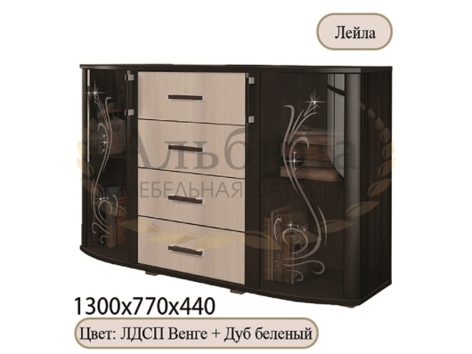 Комод Лейла будет гармоничным и необычайно практичным дополнением интерьера любой комнаты. Вместительные отделения с глухими дверцами и четыре выдвижных ящика можно использовать для аккуратного хранения одежды, постельного и нижнего белья, разнообразных аксессуаров, игрушек, красивых скатертей, нежных полотенец, столовых приборов и многого другого. На комоде Вы сможете разместить красочные семейные фотографии, вазу с красивыми цветами и оригинальные предметы декора. -