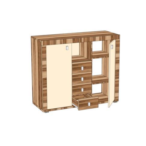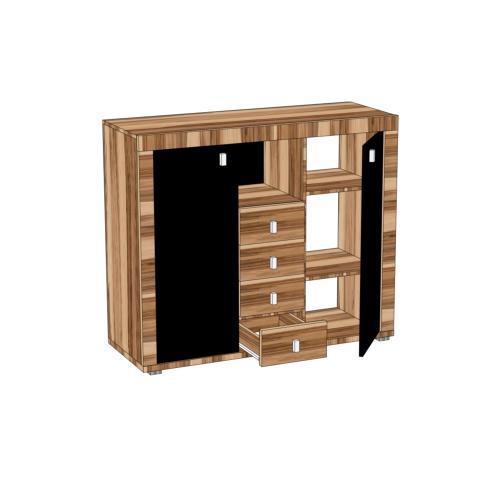 Комод Сканди за распашными дверьми имеет ниши с двумя полками. В центре размещено четыре выкатных ящика на роликовых направляющих. Такой комод вполне способен заменить громоздкий шкаф и разместить множество вещей - одежду и белье, косметику и аксессуары, книги и журналы.