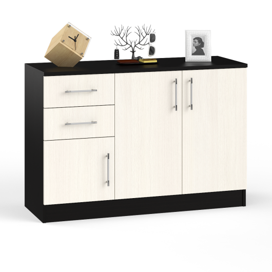 Комод СВК № 3 станет замечательным дополнением для обустройства комфортной и функциональной комнаты. Изделие предоставит дополнительно место для бережного хранения гардероба. Два вместительных выдвижных ящика и полки, скрытые за распашными дверцами, созданы для размещения одежды, постельного и нижнего белья, а также всевозможных аксессуаров и косметики.