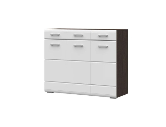 Удобный и функциональный комод подойдет для современного интерьера спальни. Модель порадует вас своей функциональностью и вместительностью. В комоде есть 3 маленьких выдвижных ящика и 3 двери. -