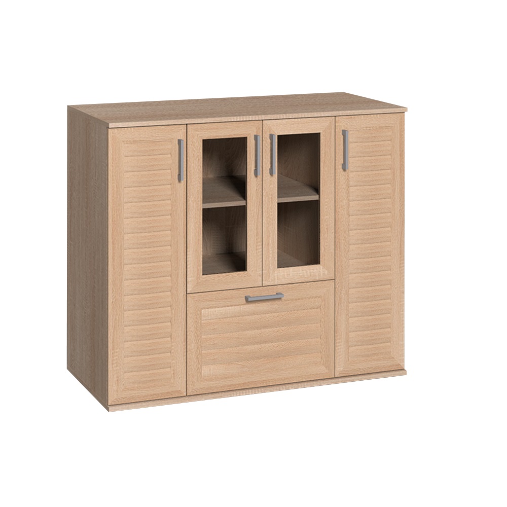 Тумба МЦН 5 Регата станет практичным и незаменимым предметом в вашей гостиной. Изделие является практичным и вместительным предметом интерьера, который также подойдет для установки ТВ. Центральные рамочные фасады со стеклянным вкладышем скрывают нишу с полкой из ЛДСП, регулируемой по высоте. В боковых отделениях с глухими фасадами расположены по три полки с каждой стороны. Вместительный нижний ящик на шариковых направляющих полного выдвижения выдерживает нагрузку 13 кг. Мебель Регата с фасадами, напоминающими жалюзи, насыщает интерьер средиземноморским колоритом, который навевает воспоминания о летних беззаботных каникулах.