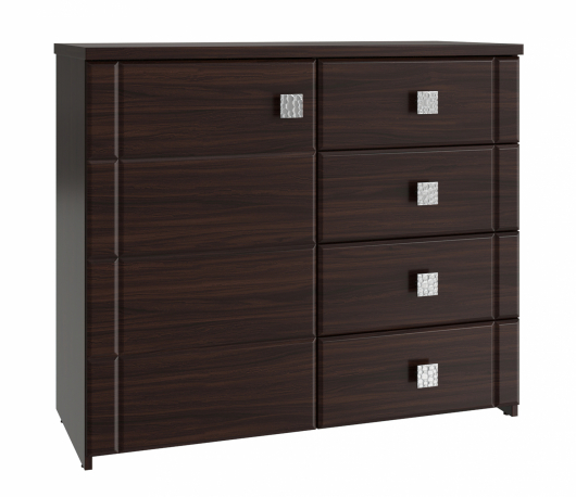 Комод Изабель ИЗ-52К9 очень функционален. Изделие оборудовано четырьмя выдвижными ящиками и тремя полками, которые скрыты за распашной дверкой.