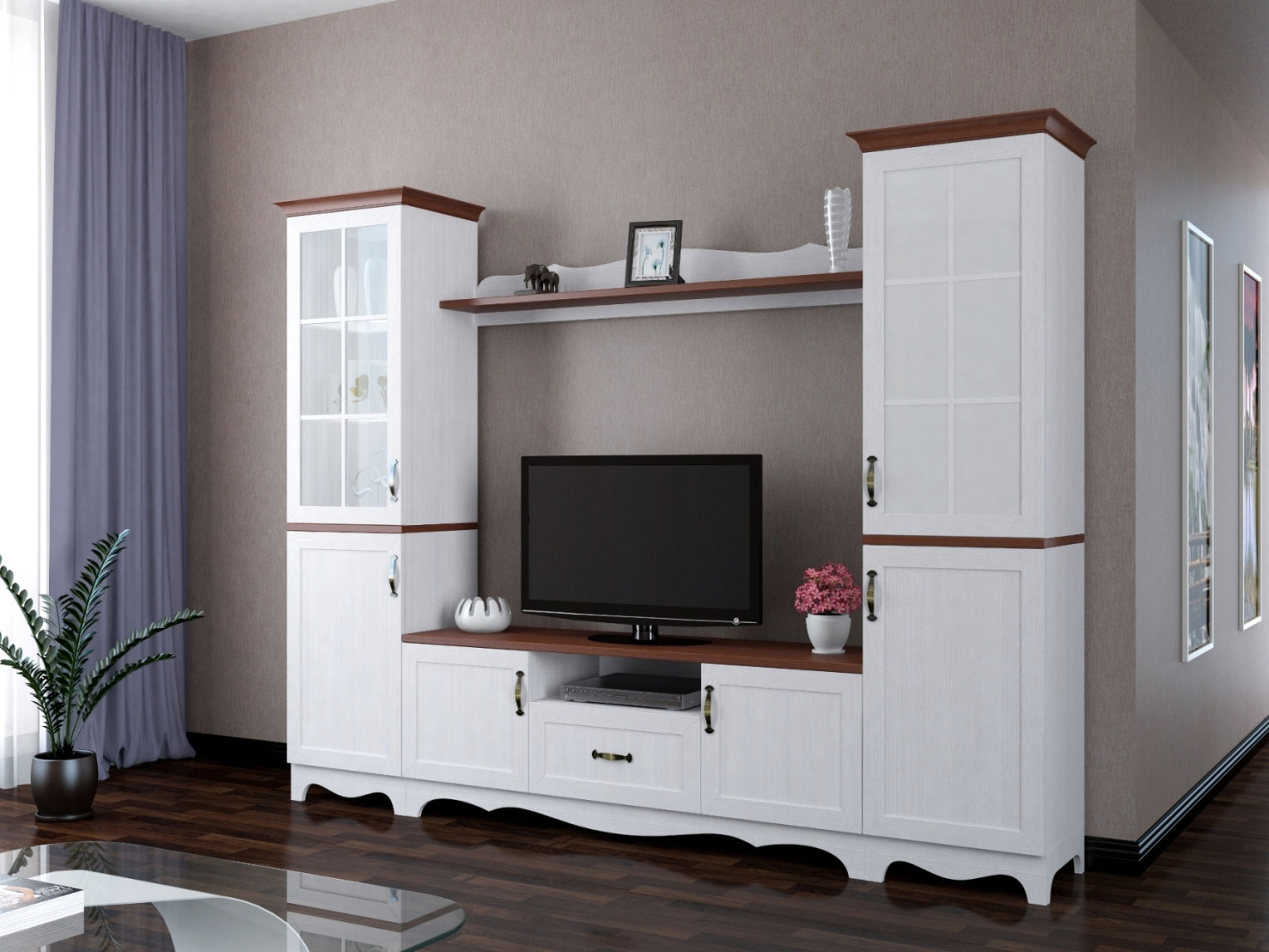Гостиная "Вентура" - современная классика у вас дома. Гостиная "Вентура" изготовлена из ЛДСП класс эмиссии Е-1 цвет рамух белый, орех донской. Карнизы и рамочный профиль на фасадах изготовлены из МДФ.