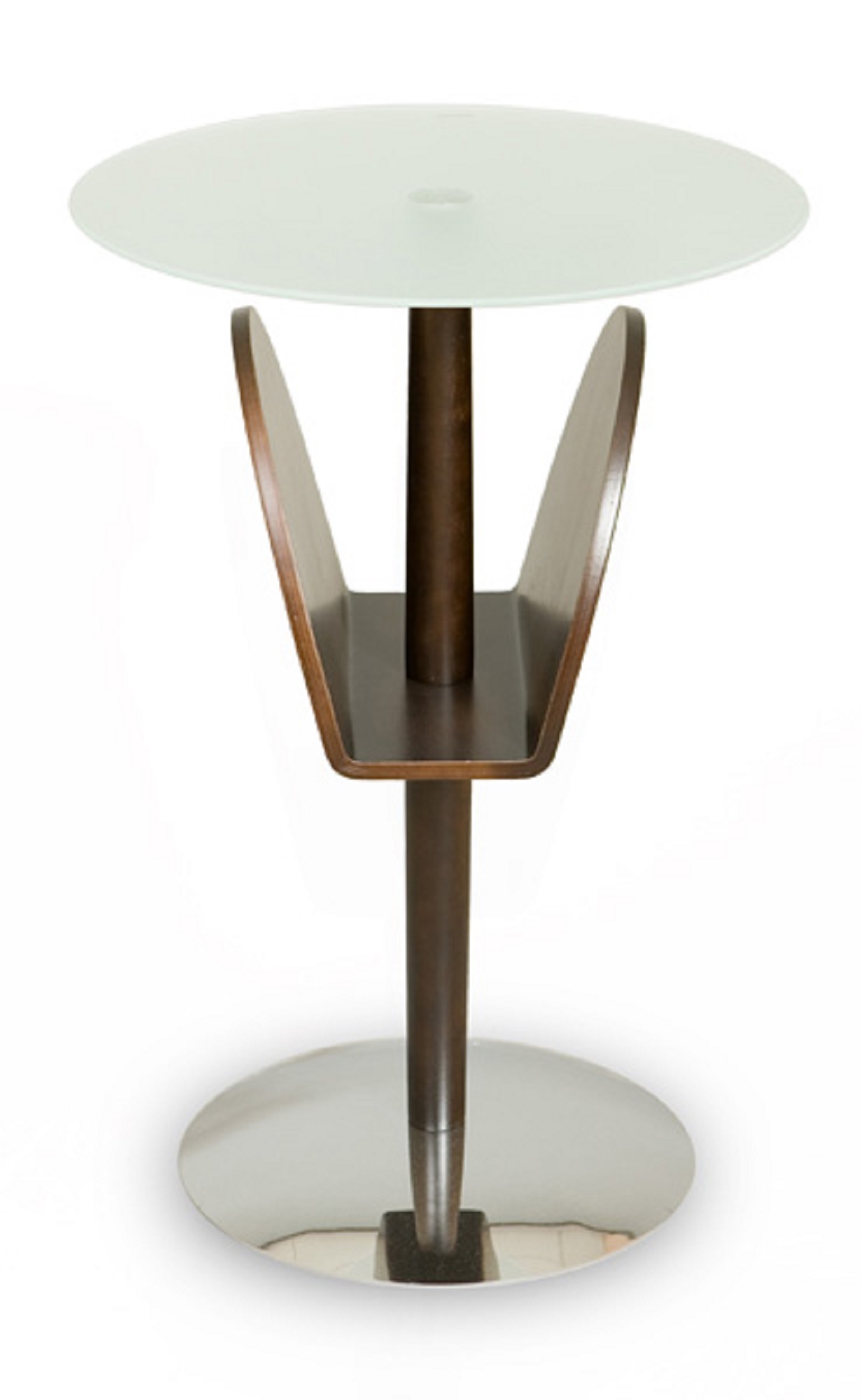 Кофейный столик с подставкой для журналов и газет. Ножка выполнена из массива гевеи и имеет толщину 32 мм. Подставка для газет изготовлена из гнутой фанеры толщиной 10 мм. Столешница - закаленное стекло толщиной 5 мм. основание — хромированный металл.