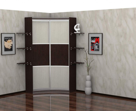 Радиусный шкаф-купе Радиус довольно компактная модель. Внутри есть полки и штанга. Очень удачная модель, позволит сделать угол полезным. Шкаф может быть доукомплектован по желанию клиента боковыми элементами – комплектом из 3 полукруглых открытых полок с креплением «тукан». Оснащен двумя штангами для вешалок, большим количеством полок, крючками.
