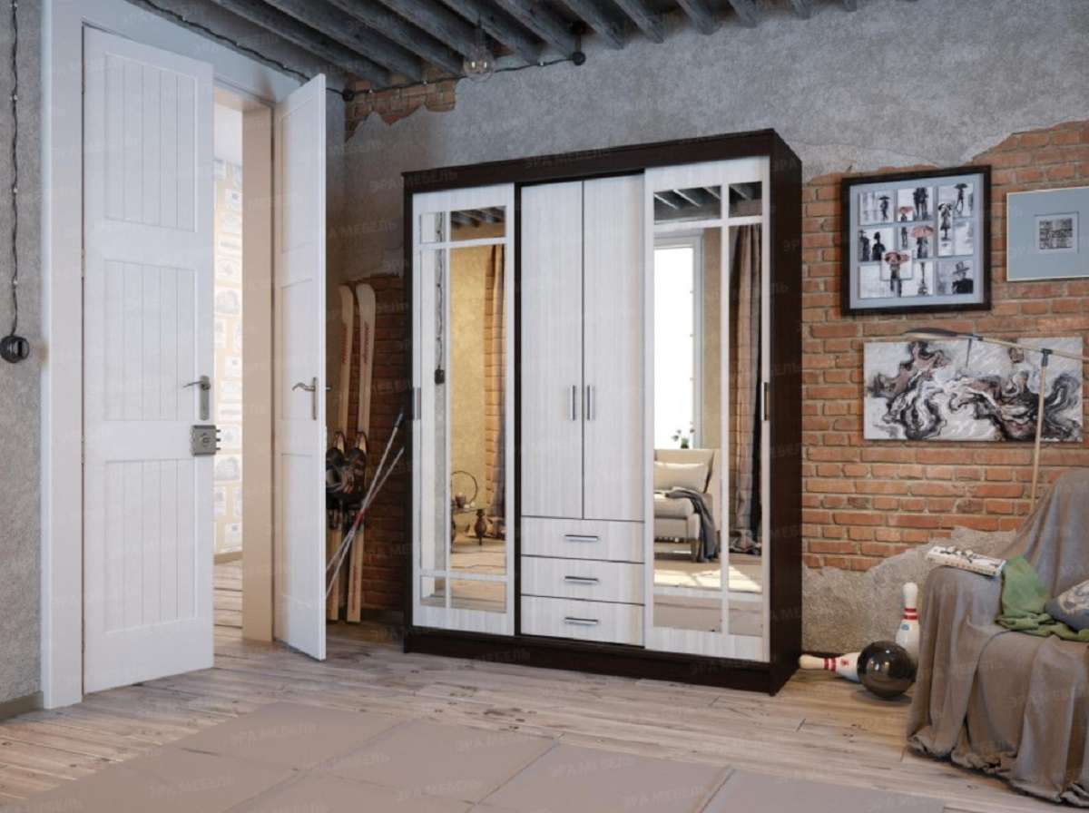 Большой и вместительный шкаф-купе ЛОРД заменит собой небольшую гардеробную. Благодаря наличию полок, ниш, ящиков и двух секций со штангами для вешалок, он оказывается невероятно удобным и функциональным. Высокий шкаф заметно экономит пространство в комнате. А большие зеркала визуально делают комнату просторнее и светлее. Функциональное наполнение: два отделения со штангами для вешалок, полки и 3 выдвижных ящика, высокие зеркала. Вместительный: длинная стационарная штанга для вешалок. Функциональный: два платяных шкафа, полки, ящики, высокие зеркала. -