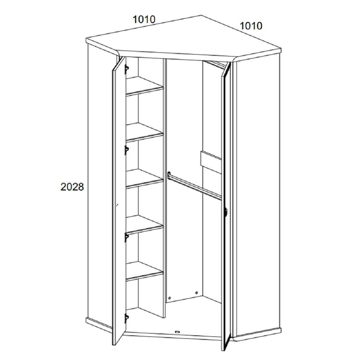 Шкаф для одежды угловой 2D Магеллан сохранит Ваши вещи и освободит полезное пространство в комнате, а также поможет Вам компактно и функционально обустроить помещение любого размера. Изделие предоставит достаточно места для бережного хранения Вашего гардероба. За двумя распашными дверьми находится широкая штанга для вешалок-плечиков, несколько полок для размещения одежды. -
