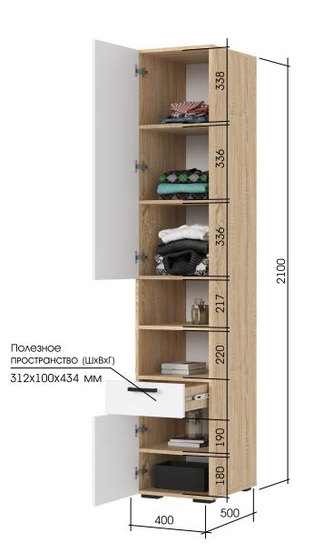 Ширина, мм 400 Глубина, мм 500 Высота, мм 2100 ?МатериалМатериал изготовленияЛДСП Производитель Вариантов исполнения 1 -