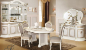 В состав гостиной Роза (вариант 1) входят следующие элементы: витрина 4-х дверная, раскладной обеденный стол, комод, зеркало и стул - 4 шт. Комплектация может быть с 6-ю стульями.