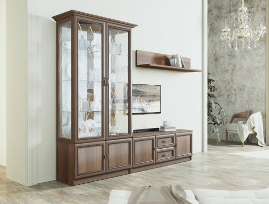 Гостиная Ажур 1 обеспечит комфорт и уют в вашей комнате. На полках, скрытых за дверьми со стеклом, будут гармонично смотреться элегантные бокалы, чайные наборы, интересные книги и оригинальные предметы декора. За глухими дверцами можно хранить более ценные и важные вещи. Комод поможет разместить телевизор на высоте, подходящей для комфортного просмотра. Два вместительных выдвижных ящика и полки, скрытые за распашными дверцами, пригодятся для хранения сложенной одежды и белья, постельных наборов, посуды и скатертей, а также других различных вещей. Навесная полка предоставит дополнительное место для аккуратного хранения предметов, которые хочется видеть каждый день. Мебель Ажур отличается сдержанной роскошью, простыми линиями и интересными изюминками декорирования.