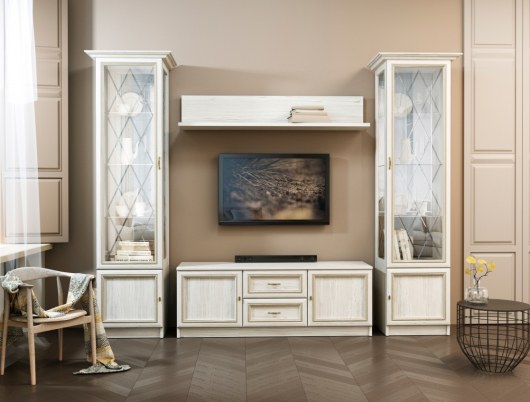 Гостиная Ажур 3 обеспечит комфорт и уют в вашей комнате. На полках, скрытых за дверьми со стеклом, будут гармонично смотреться элегантные бокалы, чайные наборы, интересные книги и оригинальные предметы декора. Комод поможет разместить телевизор на высоте, подходящей для комфортного просмотра. Два вместительных выдвижных ящика и полки, скрытые за распашными дверцами, пригодятся для хранения сложенной одежды и белья, постельных наборов, посуды и скатертей, а также других различных вещей. Навесная полка предоставит дополнительное место для аккуратного хранения предметов, которые хочется видеть каждый день. Мебель Ажур отличается сдержанной роскошью, простыми линиями и интересными изюминками декорирования.