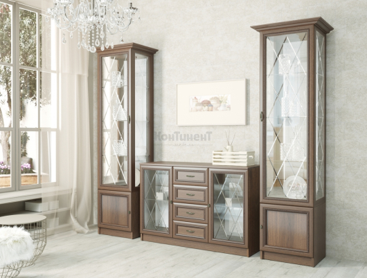 Гостиная Ажур 4 обеспечит комфорт и уют в вашей комнате. На полках, скрытых за дверьми со стеклом, будут гармонично смотреться элегантные бокалы, чайные наборы, интересные книги и оригинальные предметы декора. Четыре вместительных выдвижных ящика комода пригодятся для хранения сложенной одежды и белья, постельных наборов, посуды и скатертей, а также других различных вещей. Мебель Ажур отличается сдержанной роскошью, простыми линиями и интересными изюминками декорирования.