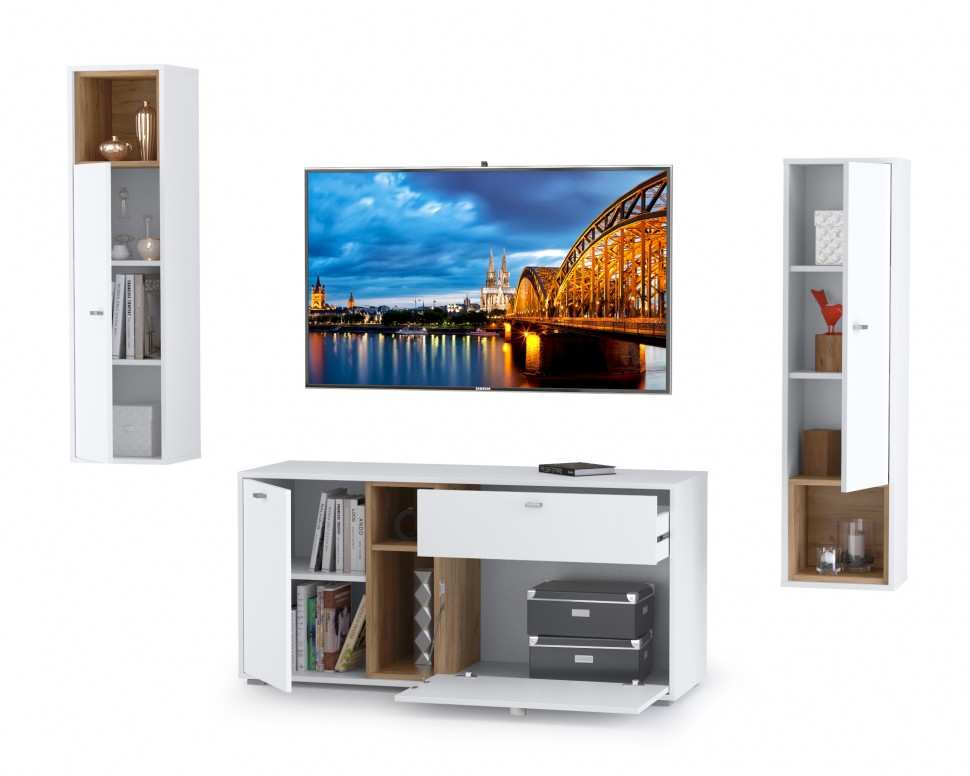 Гостиная Бэль (вариант 5) поможет создать уютную и современную обстановку в вашей гостиной. Теперь у вас будет уютная комната, в которой вы сможете проводить свободное время со своей семьей или друзьями. За распашными дверцами шкафов находятся полки, созданные для бережного хранения различных предметов, в том числе одежды. В открытых нишах и на навесной полке будут гармонично смотреться интересные и увлекательные книги, семейные фотоальбомы, коллекция интересных предметов, оригинальные сувениры, статуэтки, детские поделки и многое другое. Тумбу можно использовать в качестве подставки под телевизор для более комфортного просмотра новостей, сериалов и различных телепередач, а ниши предназначены для необходимой аппаратуры. Полочка навесная используется не только как украшение интерьера красивыми вазочками и семейными фото и декором.