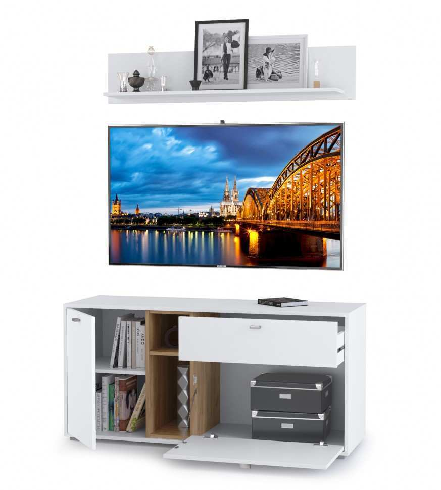 Гостиная Бэль (вариант 5) поможет создать уютную и современную обстановку в вашей гостиной. Теперь у вас будет уютная комната, в которой вы сможете проводить свободное время со своей семьей или друзьями. За распашными дверцами шкафов находятся полки, созданные для бережного хранения различных предметов, в том числе одежды. В открытых нишах и на навесной полке будут гармонично смотреться интересные и увлекательные книги, семейные фотоальбомы, коллекция интересных предметов, оригинальные сувениры, статуэтки, детские поделки и многое другое. Тумбу можно использовать в качестве подставки под телевизор для более комфортного просмотра новостей, сериалов и различных телепередач, а ниши предназначены для необходимой аппаратуры.