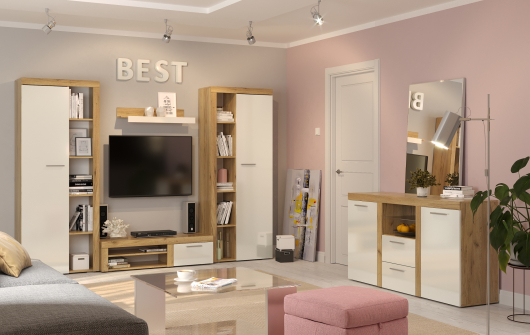 - комод Best мод.№9 - Ш1480 x Г402 x В820 мм.Гостиная Best (вариант 6) прекрасно впишется в интерьер современной комнаты. Комплект мебели поможет обустроить уютное помещение, где вы будете собираться всей семьей для проведения свободного времени, а также принимать гостей. Открытые полочки витрины предоставят достаточно места для размещения различных предметов, которые радуют, а также интересные книги, семейные фотографии, оригинальные сувениры и статуэтки. За распашной дверью вы сможете хранить более ценные вещи, одежду, чайные сервизы и многое другое. Тумба ТВ поможет на правильной высоте разместить телевизор для более комфортного просмотра новостей, фильмов, сериалов и различных телепередач, а открытые ниши пригодятся для необходимой аппаратуры. Комод предоставит дополнительное место для хранения наборов посуды, книг, семейных фотоальбом, одежды, различных аксессуаров, украшений и косметики.
