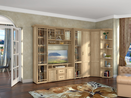 Гостиная Бруно (вариант 3) поможет правильно организовать пространство и создать необычайно уютную и комфортную атмосферу в вашей гостиной. За распашными дверьми со стеклом находятся полки, на которых будут гармонично смотреться наборы посуды, чайные сервизы, семейные фотографии, интересные книги, памятные сувениры, необычные статуэтки и оригинальные предметы декора. За глухими дверцами вы сможете хранить скатерти, полотенца или некоторые вещи из гардероба. Тумба для ТВ поможет разместить телевизор на правильной высоте для комфортного просмотра познавательных телепередач и увлекательных фильмов. Открытые ниши предназначены для необходимой аппаратуры, а два вместительных выдвижных ящика и отделения с дверцами пригодятся для хранения разнообразных предметов. За распашными дверьми углового шкафа и пенала находятся штанги для вешалок-плечиков с безупречно выглаженной одеждой, а для размещения другой одежды, постельного и нижнего белья, различных аксессуаров и коробок с обувью предназначены полки. На пяти открытых полочках стеллажа будут гармонично смотреться семейные фотографии, любимые детские игрушки, интересные книги, небольшие вазоны с цветами, памятные сувениры, необычные статуэтки и оригинальные предметы декора.