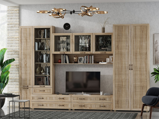 Гостиная Инесса (вариант 4) обеспечит комфорт и уют в вашей комнате. За распашными дверьми 2-х дверного шкафа находится широкая штанга для вешалок-плечиков, а антресольная и нижняя полки пригодятся для сложенной одежды, белья, обуви и различных аксессуаров. На навесной полке и полках, скрытых за стеклянными дверьми, вы сможете разместить наборы посуды, чайные сервизы, семейные фотографии, интересные книги и оригинальные предметы декора. Специальная тумба поможет разместить телевизор на определенной высоте для более комфортного просмотра.