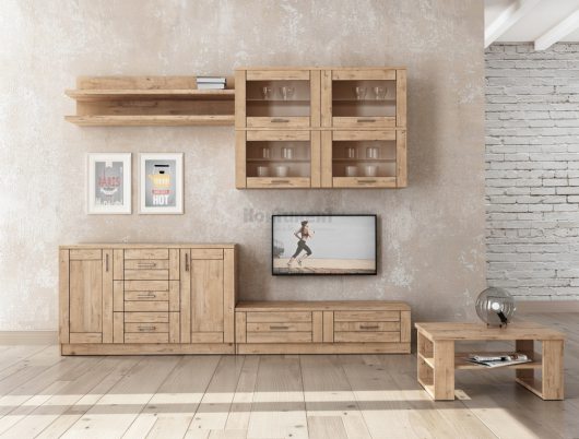 Гостиная Кантри (вариант 2) обеспечит комфорт и уют в вашей комнате. На полках, скрытых за дверью со стеклом, будут гармонично смотреться элегантные бокалы, чайные наборы, интересные книги и оригинальные предметы декора. Тумба ТВ поможет разместить телевизор на высоте, подходящей для комфортного просмотра. Выдвижные ящики тумбы и комода пригодятся для хранения сложенной одежды и белья, постельных наборов, посуды и скатертей, а также других различных вещей. Полки предоставят дополнительное место для аккуратного хранения предметов, которые хочется видеть каждый день. Мебель Кантри создана для тех, кто не любит излишеств и предпочитает простоту и стиль. -