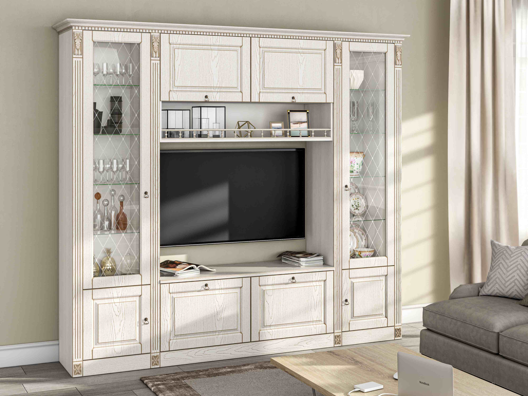 Гостиная Вероника выполнена в белоснежном цвете бодега светлая с отделкой патиной. Элегантный классический стиль гостиной с сочетанием светлых тонов фасадов и отделки делает комплект воздушным, утонченным и парящим.