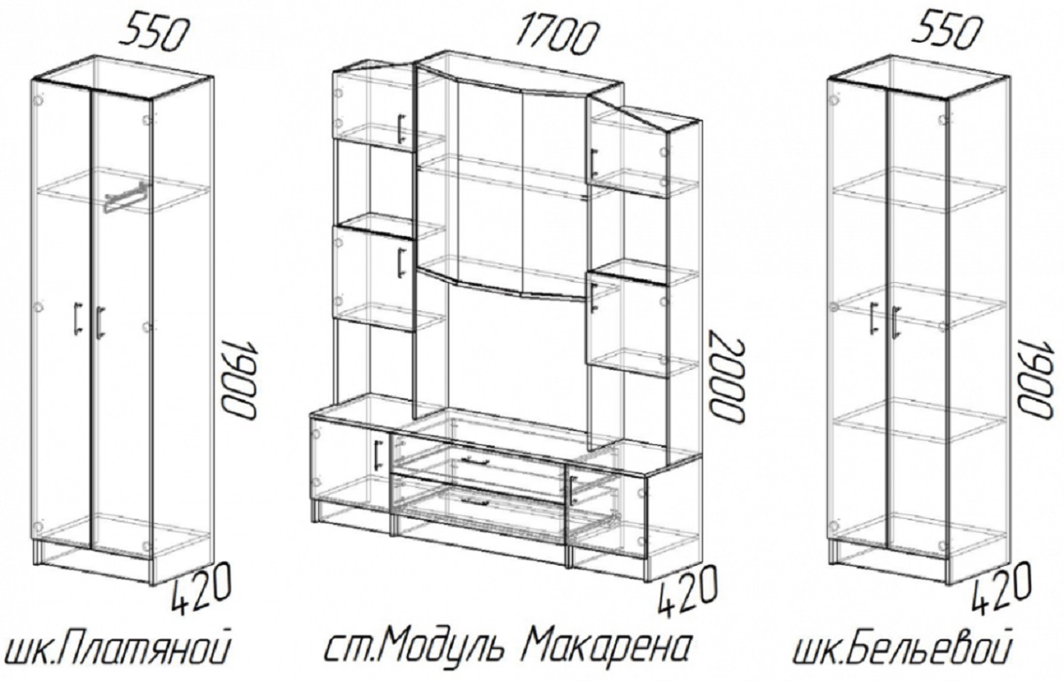 Ширина, мм 2800 Глубина, мм 420 Высота, мм 2000 ?МатериалМатериал изготовленияЛДСП Производитель Вариантов исполнения 1 -