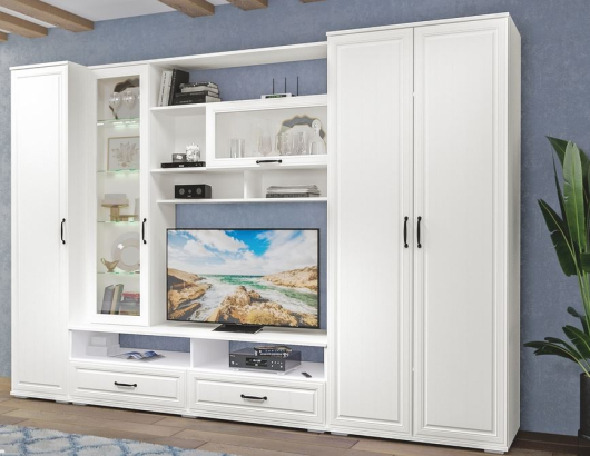 Стенка Кёльн 2 выполнена в модном белом цвете. Фасады с рамкой, тёмная фурнитура, стеклянные витрины, всё это делает коллекцию Кёльн красивой и благородной. В шкафах вы сможете разместить, одежду, книги, аксессуары. Шкафы, выдвижные ящики и полки в витрине делают мебель очень функциональной.