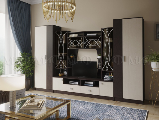 Стенка Женева имеет стильный дизайн. Закруглённые, тонированные стёкла с пескоструйным рисунком делает гостиную Женева элегантной и красивой. Сочетание тёмного и светлого тона придаёт стенке Женева особую изюминку. Гостиная Женева имеет очень функциональное наполнение. -