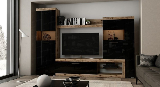 Гостиная Бастон является практичным вариантом для обустройства стильной комнаты. Открытые ниши и закрытые отделения предоставят достаточно места для размещения абсолютно всех вещей: посуды, книг и предметов декора. Для телевизора предназначена широкая зона по центру. Сочетание корпуса изделия в древесных оттенках и глянцевых фасадов со вставками из стекла делают мебель яркой и современной. -