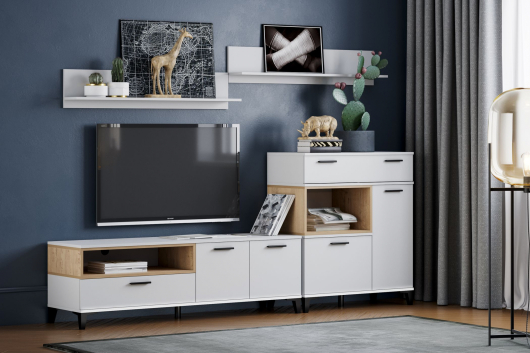 - тумба Bergen НМ 013.80 - Ш902 x Г440 x В1044 мм.Гостиная Bergen (вариант 3) поможет правильно и со вкусом обустроить уютную комнату, где вы сможете отдыхать и проводить время всей семьей. Специальная тумба позволит разместить телевизор и всю необходимую аппаратуру. Навесные полки и открытые ниши пригодятся для семейных фотографий, красивых цветов и оригинальных предметов декора. За распашными дверьми находятся отделения, которые предоставят достаточно места для различных вещей.