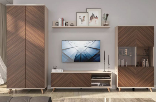 Гостиная Хармони стильное решение для современного интерьера. Элегантное сочетание бежевого корпуса и древесного фасада создаёт атмосферу гармонии и уюта в интерьере. Благодаря современным механизмам Push to Open дверцы открываются легко и бесшумно, обеспечивая удобство использования и сохраняя эстетичный внешний вид мебели. Необычный дизайн фасада гостиной Хармони придаёт изюминку коллекции.