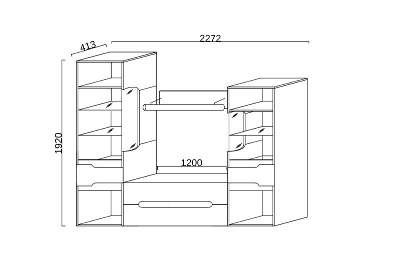 Ширина, мм 2272 Глубина, мм 413 Высота, мм 1920 ?МатериалМатериал изготовленияЛДСП, МДФ Производитель Вариантов исполнения 1 -
