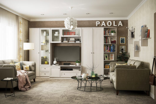 - Полка угловая Paola 14 - Ш590 x Г400 x В2107 мм.Гостиная Paola (вариант 2) позволит создать гармоничный и стильный интерьер, оживить тусклую комнату и придать ей свежести, сделав пребывание более комфортным. Оптимальная высота конструкции тумбы ТВ позволит расположить телевизор на комфортной для глаз высоте. За дверцами со стеклянными вставками вы сможете разместить красивую посуду, сувениры или предметы декора. Контрастное серое стекло защитит их от пыли, перепадов температур и случайных прикосновений рук. А вещи, которые не желательно выставлять напоказ, спрячьте за глухими фасадами. На шести полукруглых полочек стеллажа вы сможете разместить различные маленькие аксессуары: рамки с фотографиями, вазы, горшечные растения и другие разнообразные предметы, добавив в помещение функциональную практичность. Мебель Paola способна подчеркнуть стиль вашей гостиной и сделать ее многофункциональной, а белые акценты визуально сделают помещение светлым и просторным.
