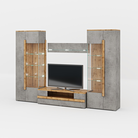 Гостиная Римини (вариант 1) поможет стильно и со вкусом обустроить самую уютную и гостеприимную комнату в вашем доме. Специальная тумба поможет на уровне глаз разместить телевизор для комфортного просмотра, а открытая ниша пригодится для всей необходимой аппаратуры. Шкафы-витрины созданы для красивого размещения наборов роскошной посуды, хрустальных предметов, чайных сервизов, дорогого алкоголя, интересных статуэток и сувениров, увлекательных книг и коллекции оригинальных предметов. Навесная полка предоставит достаточно места для красивого размещения семейных фотографий, вазы с красивыми цветами и интересных предметов декора.