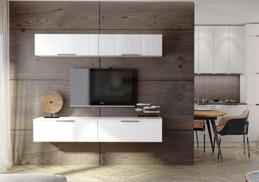 Гостиная Слайд стильное и современное решение для интерьера. Мягкое и бесшумное закрытие фасадов обеспечивают четырехшарнирные петли с доводчиками. Направляющие шариковые плавного закрывания. А благодаря креплению модулей к стене на надежные навесы SCARPI, ваша гостиная будет выглядеть легкой и воздушной. -
