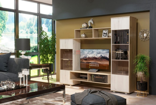 Ассиметричные формы и стекло создают образ гостиной в современном стиле. Гостиная Александра - 2 невероятно вместительный вариант. В ней вы сможете расположить телевизор, всю необходимую аудиотехнику,